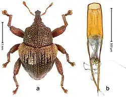 The legs and elytral base may be ferruginous or dark ferruginous, nearly black. Females have a more slender body. The female rostrum is dorsally punctate-rugose, with a glabrous median ridge flanked by rows of punctures and a pair of sublateral furrows. The epistome is simple. Female elytra are subovate, lacking swellings, with a convex lateral contour and simple humeri. The basal scales are indistinct.[1]