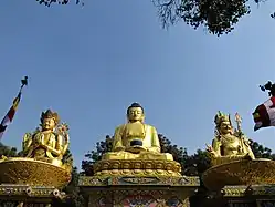 The Nirmāṇakāya (Ch: 化身, 應身; Tib. sprul sku; the body of transformation, emanation, manifestation or appearance) is a reflection of the Saṃbhogakāya, one of the myriad magical manifestations created by the Saṃbhogakāya.[47] It is also called rūpa-kaya, the "form body" or "physical body". The Nirmāṇakāya generally refers to a Buddha's human-like appearance in imperfect worlds like ours, which appear for limited periods of time and seemingly die in paranirvana. It is usually associated with "historical" Buddha figures, like Shakyamuni Buddha.[2] It is thus the most historic, temporally and spatially contingent, and humanistic aspect of the three bodies.[20]