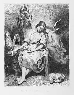 Nourrit's La Sylphide was in turn adapted as the opera The Mountain Sylph, by English composer John Barnett and librettist Thomas James Thackeray in 1834.[10] It was staged in cities throughout England, Scotland, and Ireland through 1906, as well as Sydney, Australia 1846-49.[11] The plot of Trilby is almost unrecognizable: it starts similarly to La Sylphide, but continues to a happy ending.[10] Eolia, the Mountain Sylph, falls in love with Donald, a Scottish peasant, and he with her. However, Donald is engaged to Jessie, who is loved by Donald's friend and rival Christie. Christie summons the Wizard Hela, enemy of the sylphs, who gives Donald a cursed scarf. When Donald puts the scarf on Eolia, she loses her wings, and is carried off by the fiend Astaroth. Etheria the Sylthid Queen gives Donald a magic rose to make him and Christie invisible, the two rescue Eolia, and Donald marries her while Christie marries Jessie.[11]