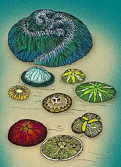 Rugoconites is a genus of oval-circular-shaped preserved in high relief about 6 centimetres (2.4 in) or more in diameter. The shape of Rugoconites is different in both of its species; R. enigmaticus (Glaessner & Wade, 1966) is more dome shaped and R. tenuirugosus (Wade, 1972) is flatter although bigger.[9] Wade (1972) interpreted the multiple lobes of Rugoconites as being tentacles. The multiple bifurcating lobes radiating from a centre served to distinguish Rugoconites from the sponge Palaeophragmodictya the lobes were then reinterpreted as being traces of a Gastrovascular system.[4] However this idea was countered by Sepkoski (2002) who went on to actually classify the genus into the Cnidaria instead of the Porifera.[10] Ivantstov & Fedonkin (2002) went on to classify Rugoconites into the Trilobozoa by suggesting it had triradial symmetry.[3]