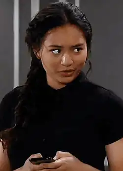 In the summer of 2017, Josslyn notes that Trina is allowed to date while she is not.[42] During her sophomore in high school, Trina starts dating a junior and they consider having sex. Trina worries her mom will find the condoms so she convinces Josslyn to hide them for her.[43] In the summer of 2018, Trina worked as an intern at the Port Charles Museum of Fine Arts.[44] In 2020, Trina is revealed to be Taggert and Portia's daughter.[45] Her parents divorce so early that Trina never experienced their relationship outside of co-parenting as Portia felt Taggert's career took priority over their family. While Taggert is always present in Trina's life, Portia and Taggert agree to keep distance between them for safety reasons. Because of the distance, Trina doesn't know much about her parents' marriage and Portia doesn't talk about it.[46] Mikayla described her character to Cliché Magazine in 2021: "Trina is an 18-year-old straight-A student, with a passion for track and a love for art."[33] She also loves art history and some of her favorite artists include David Driskell and Romare Bearden. Because Portia is a doctor, Trina also grows up exploring her mother's medical journals.[47]