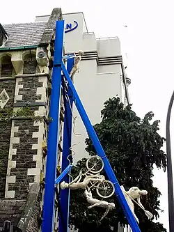 The former church was damaged in 4 September 2010 Canterbury earthquake and the tower braced with an external steel structure; it was a much photographed item for its decoration with mannequins. Within two months, the restaurant was operating again. The building suffered further damage by the strong aftershock on Boxing Day of that year that was centred underneath the central city. Within two days, the restaurant opened again.[13]