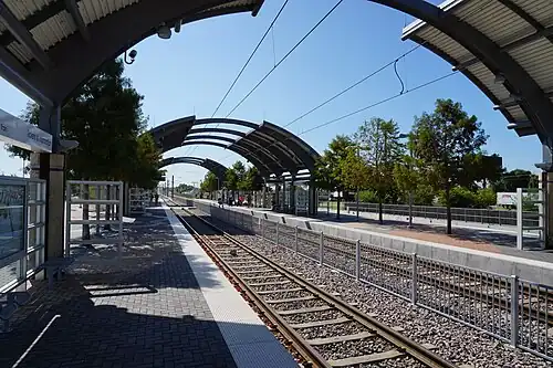 Trinity Mills station is a train station in Carrollton, Texas. It serves DART light rail's Green Line[4] and DCTA's A-train hybrid rail line. It is the southern terminus of the latter. On A-train maps, the station is represented by a yellow circle containing the DART logo.[5]