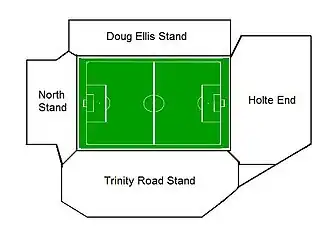 Villa Park has 43,205 seats,[40] split between four stands.[1] These four stands are the Holte End to the south, the Trinity Road Stand to the west, the Doug Ellis Stand opposite the Trinity Road Stand, and the North Stand behind the northern goal.[1] All of the stands have two tiers except the Trinity Road Stand, which has three.
