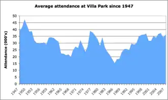 Regular ground developments and innovations began from 1969 under the direction of the new chairman, Doug Ellis, who set about redeveloping Villa Park for the modern era. Much of the stadium had fallen into disrepair and was in need of modernisation; Villa's attendances and financial situation had also declined as a result of losing their First Division status in 1967 and going down to the Third Division for the first time in 1970.[32] Ellis updated the infrastructure, installed a new public address system, carried out plumbing work which included installing new toilets, resurfaced the terraces, and built a new ticket office. His tenure saw executive lounges replace the old offices in the Trinity Road Stand.[32]