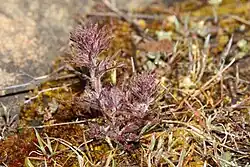 Its leaves are greenish, red or purple because of the anthocyanin pigments that the plants produce. They are up to 3 centimeters long and divided into a few narrow, pointed lobes.