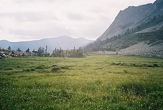 ![]() Tamarack Meadow at 9,500 feet (2,900 m), below Triple Divide Peak, in the backcountry of Sequoia National Park | |