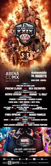 Triplemanía XXIX was a professional wrestling supercard event produced and scripted by the Mexican professional wrestling promotion Lucha Libre AAA Worldwide (AAA). The event took place on August 14, 2021 at Arena Ciudad de México in Mexico City. It marked the 29th year in a row that AAA has held a Triplemanía show, and the 35th overall show held under the Triplemanía banner since 1993. The annual Triplemanía show is AAA's biggest event of the year, serving as the culmination of major storylines in what has been described as AAA's version of WrestleMania or their Super Bowl event. The event saw the return of live ticketed fans, marking one of the first times AAA allowed this during the COVID-19 pandemic.