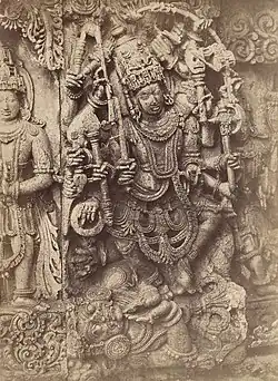 Tripurasura (Sanskrit: त्रिपुरासुर) is a trio of asura brothers named Tarakaksha, Vidyunmāli and Kamalaksha, who were the sons of the asura Tarakasura. These three began to perform severe tapasya. They were then granted boons by Brahma to have three forts: gold, silver, and iron, which angered the Devas. Vishnu then made a new religion to make them evil, and the objective of killing the asuras was taken upon by Shiva, which took three days on the battlefield, finally killing Tripurasura and destroying the three cities. This occurred on the full moon day in the Kartik month and therefore the day is celebrated as Tripurari Pournima.[1]