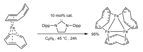 In benzene, the Dipp substituted NHC reacts with Fe(COT)2 to produce large black rhomboidal crystals of tris(cyclooctatetraene)triiron over 24 h at room temperature. Notably, the reaction was found to occur with catalytic amounts of NHC (10 mol%) yielding 67% of Fe3(COT)3 after 24 h (turn over number=9.5). The synthesis is optimized when the reaction is conducted at 45 °C, yielding 95% conversion to the tris(cyclooctatetraene)triiron cluster. They also highlighted that heating Fe(COT)2 in benzene without any NHC to 100 °C for 24 h forms trace amounts of Fe3(COT)3, but also large amounts of iron metal. Unsurprisingly, elemental analysis of the cluster affirms a 1:1 Fe:COT ratio.[1]