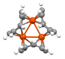 The crystal structure reveals that the three iron centers arrange in an equilateral triangle (nearly ideal; Fe1 = 59.67°, Fe2 = 60.15°, and Fe3 = 60.18°) The corresponding bond lengths are similar to one another, (Fe1–Fe2 = 2.829 Å, Fe1–Fe3 = 2.815 Å, and Fe2–Fe3 = 2.830 Å), and reflective of Fe-Fe single bonds.[10] As a trinuclear cluster, it would be thought to have a stable 48-electron closed-shell configuration (24 electrons from the three iron atoms and 24 electrons from the three COT rings).[11][12][13]