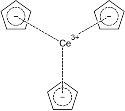 Tris(cyclopentadienyl)cerium is a metal organic compound of cerium with the chemical formula Ce(C5H5)3. It and the other cyclopentadiene compounds of the lanthanide metals are different from the cyclopentadienyl complexes of general transition metals and is considered to be ionically bonded.[1]