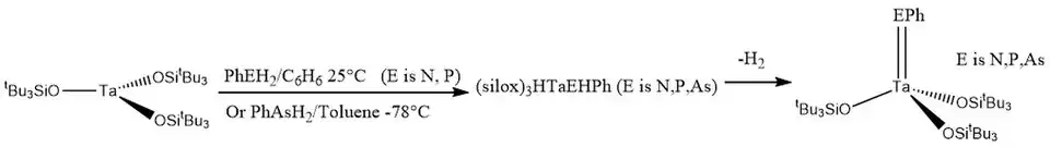 As tris(silox)Ta reacts with PhAsH2, PhPH2, and PhNH2, the corresponding pnictide hydride is formed through oxidative addition which will lose H2 to form the pnictinidene complex: