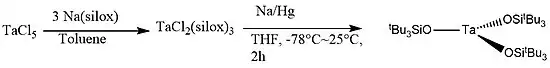 The synthesis of tris(silox)tantalum was first reported in 1986 by Lapointe, Wolczanzki, and Mitchell.[1] The precursor, (silox)3TaCl2, is obtained by reacting TaCl5 with 3 equivalents of Na(silox) at reflux in toluene.[2] Then, (silox)3TaCl2 is reduced to the synthetic target tris(silox)tantalum using 0.9% Na/Hg (4.0 eq. Na) in THF cooled in dry ice bath and stirred at room temperature for two hours.
