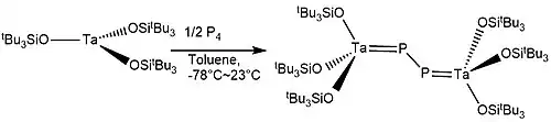 Tris(silox)Ta reacts with half-equivalent of P4 in toluene for 6 hours to give the compound [(silox)3Ta]2 (μ:η1 ,η1 -P2):[6]