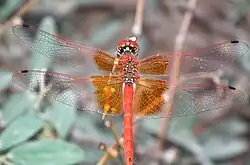The adult male abdomen measures 21–24 mm and hind wing 24–27 mm. Female abdomen measures 23 mm and hind wing 26–30 mm. The male is a medium-sized scarlet dragonfly with a broad reddish amber patch on the base of transparent wings. The female is similar to the male, but duller in color.[3] Its natural habitats are subtropical or tropical streams and rivers. It breeds in marshes, ponds, and lakes, and prefers to perch on exposed rocks, dry areas, and boulders in riverbeds.[6][7][8][3][4]