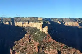 Tritle Peak is an 8,388-foot (2,557 m) prominence adjacent Roosevelt Point, on the East Rim of the Walhalla Plateau (East Kaibab Plateau). It is located in far eastern Grand Canyon, of Northern Arizona. The peak is only about 0.4 miles (0.64 km) northeast of Roosevelt Point on an eroded ridgeline, and it is a very short caprock remainder of Coconino Sandstone cliffs upon Hermit Shale slopes. The entire ridge is a bright dark-burnt-red from the Hermit Shale, and sits on a ridgeline-platform of Supai Group unit 4, the Esplanade Sandstone.