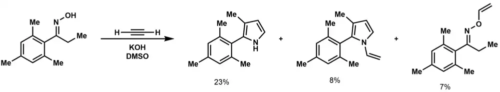 2-mesityl-3-methylpyrrole was synthesized in 2004 via the Trofimov reaction. The reaction of the ketoxime with acetylene yielded a mixture of products with the primary one being the N-H pyrrole. Small amounts of the N-vinyl product were also observed as well as O-vinylketoxime. The N-vinyl product was then used in the synthesis of a new BODIPY.[5]