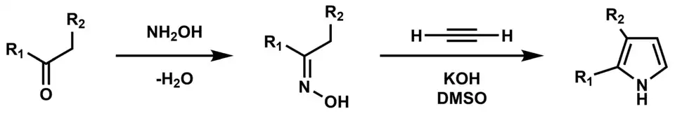 In 2005 a version of the Trofimov reaction was reported where both the hydroxylamine condensation and pyrrole formation occur in one pot. This variation uses the hydroxylamine HCl salt rather than hydroxylamine and sodium bicarbonate to perform the condensation onto a ketone. After the condensation, the reaction is warmed to 100 °C and the atmosphere in the flask is changed to acetylene. KOH is then added to form the pyrrole.[6]