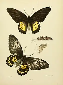 Among the largest and most gaudy of the Ceylon Lepidoptera is the great black and yellow butterfly (Ornithoptera darsius, Gray); the upper wings, of which measure six inches (15 cm) across, are of deep velvet black, the lower, ornamented by large particles of satiny yellow, through which the sunlight passes, and few insects can compare with it in beauty, as it hovers over the flowers of the heliotrope, which furnish the favourite food of the perfect fly, although the caterpillar feeds on the aristolochia and the betel leaf and suspends its chrysalis from its drooping tendrils.[4]