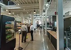 The largest building on the site is a former streetcar paint shop, known as the west car barn.[2] The building contains East Market, a public food hall and marketplace similar to the city's North Market and former East, West, and Central Markets. The building was planned to have six stalls for prepared foods, a produce vendor, and a coffee stall.[3] A 2020 report indicated it will now hold 20 stalls and a restaurant on the main floor, storage and refrigeration in the basement, and an upper floor for marketplace seating and event space. A small speakeasy-themed bar will occupy some ground-floor space, to be open to the public except during private events. A raised patio will be constructed around the building's east end, wrapping around to the north.[2]
