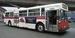 Preserved 2649 was converted into a diesel bus in 1987 but retained its trolley poles for winter wire-de-icing duty.[58] It was renumbered 3151 at that time,[58] and the trolley poles were only carried from November to March each year.[59] It was renumbered again, as V1109,[11] after being retired from service as a diesel bus in the 1990s. It was one of 49 E800s converted into diesel buses in 1987–1990, the first being no. 2650 (as bus 5199), but one of only two to retain their trolley poles for de-icing (3152, previously 2645, being the other).[58][59][11] |