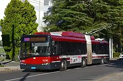 In 2010, eleven Solaris articulated trolleybuses (nos. 1056–1066) were added to the fleet,[24] and they began to enter service in December of that year.[25] The last Breda trolleybus was retired in 2012, and the last Menarini vehicles – the last two-axle vehicles in the fleet – were retired in March or April 2013.[26] From that point, the fleet comprised only articulated trolleybuses.[26]