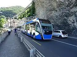 The Vevey–Villeneuve trolleybus line is the last remaining of several interurban trolleybus lines that have existed in Switzerland.[2] It largely follows Swiss main road no. 9, and passes through the municipalities of Vevey, La Tour-de-Peilz, Montreux, Veytaux and Villeneuve, and as of 2019 served a total of 41 stops.