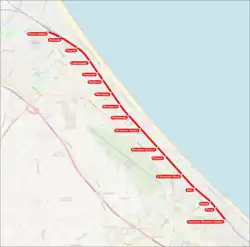 Route 11 runs entirely on roads shared with other vehicles. Starting at Via Dante Alghieri, the route serves Rimini's railway station before passing underneath the Bologna-Ancona railway next to the Porto Canale.[19] This underpass is a critical point in the line: it has a tight bend and limited overhead clearance, forcing the trolleybuses to flatten their trolley poles near their roofs, with the risk that the trolley poles will come off the wires. The route runs along Viale Principe Amedeo to reach the coastline, serving Parco Federico Fellini. The route then runs southwards along the principal seafront avenue,[b] serving Rimini's frazioni of Bellariva, Rivazzurra, and Miramare. It leaves Rimini's fare zone after the Viale Gubbio stop in Miramare, and enters Riccione's fare zone from the Viale Angeloni stop by Piazzale Allende in the comune of Riccione. It crosses the Torrente Marano and Rio Melo rivers before reaching Piazzale Curiel, where it interchanges with several local bus routes and route 125, which runs between Piazzale Curiel and Cattolica via Misano. Route 11 terminates five stops later at Terme.[19]