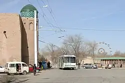 The Khiva terminus is on the northern edge of the Itchan Kala fortress (now a World Heritage Site), east of its north gate. West of the fortress is another, unused, short section of overhead wire, with a loop at the west gate. This section is not connected by switches with the regularly used section, but can be used to short cut the regular round trip.