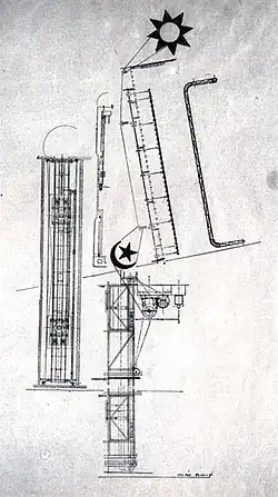 Trophy, Hypertrophied (1919) is a work of art by the German artist Max Ernst who was a pioneer of the Dada movement and Surrealism in Europe. This work is believed to be one of Ernst's earliest known pieces.[1] The work was produced using a technique called line-block printing – a type of relief printing – to which Ernst later added further detail by drawing over the design with pen and ink. It depicts a complex mechanical instrument featuring a series of pulleys, gears and planetary symbols. The style of the work resembles a schematic drawing or architectural plan. Ernst created a similar piece the same year titled Farewell My Beautiful Land of Mary Laurencen. Help! Help![1] Trophy, Hypertrophied is a part of the collection of the Museum of Modern Art in New York City, USA.[2]