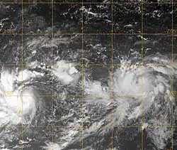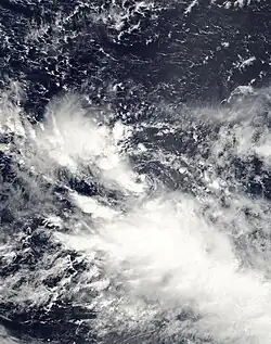 Tropical Depression 18W was a weak, short-lived tropical cyclone that brought heavy rains to parts of the Mariana Islands ahead of the more intense Typhoon Melor. Forming from an area of low pressure on September 26, 18W was first monitored by the Japan Meteorological Agency (JMA) as a tropical depression. Tracking generally towards the west, deep convection gradually developed around the system and the Joint Typhoon Warning Center (JTWC) issued their first advisory on the depression early on September 28. Although the depression initially struggled to maintain deep convection, it eventually became better organized and was upgraded to a tropical storm on September 29 by the JTWC. Several hours after reaching this intensity, the system began to rapidly dissipate as its inflow and outflow were severely disrupted by two nearby storms, Parma to the west and Melor to the east. The cyclone fully dissipated near Guam early on September 30 before being absorbed by Typhoon Parma.