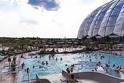 Tropical Islands Resort is a tropical-themed indoor water park located in the former Brand-Briesen Airfield in Halbe, a municipality in the district of Dahme-Spreewald in Brandenburg, Germany, 50 kilometres (31 miles) from the southern boundary of Berlin.[1] It is the largest indoor water park in the world, bigger than Canada's World Waterpark at West Edmonton Mall, and is housed in a former airship hangar (known as the Aerium), which is the biggest free-standing hall in the world and the fourth-largest building in the world by usable volume.[2] The hall belonged to the company Cargolifter until its insolvency in 2002.