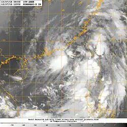 Later, the low-pressure area moved southwestward on October 12,[19] until the well-marked low pressure area of Aere re-generated into a tropical depression early on October 13.[20][21] The JMA started to tracked the tropical depression[22] and the JTWC re-issued advisories too.[23] Now moving westward, Aere had flaring convection with weak banding and was located in an area of high SSTs and low wind shear.[24] Although the system had failed to re-organize into a weak tropical storm, the JTWC issued its final advisory and shortly thereafter it made landfall several kilometers north of Da Nang, Vietnam.[25] The remnants of Aere was tracked by the JMA as a weak tropical depression on October 14.[26] It moved towards Laos and Thailand[27] until it fully dissipated later that day.[26]