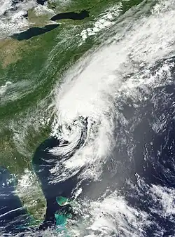 A band of thunderstorms and heavy rainfall moved across The Bahamas and dropped about 9.7 in (250 mm) of precipitation in Freeport, Grand Bahama.[22] Low-lying areas in New Providence experienced flooding.[25] Residents reported that a tornado touched down in Murphy Town, Abaco, downing power and telephone lines, overturning vehicles and damaging the roofs of three buildings.[26] Rain from the system also affected the Berry Islands, Abaco, and Bimini, as well as several smaller island groups.[25]