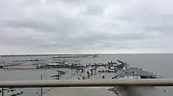 Heavy surf and high waves from Beta destroyed part of a pier in Galveston, Texas while storm surge flooding left many areas of the Texas coast under water. Around the time of landfall, a wind gust of 48 mph (77 km/h) was recorded in Port Lavaca.[33] Parts of I-69 and TX 288 were closed by flooding and high water rescue teams responded to dozens of calls for help.[34] By the time Beta had weakened to a tropical depression on September 22, over 100 high-water rescues had taken place in Houston as portions of the city became heavily inundated by the storm's high rainfall totals,[25] exceeding 9 in (23 cm) in parts of the city. Dozens of streets and highways in the city, including parts of I-69, I-45, and TX 288 and 290, were closed by fast-rising water. Officials urged residents to stay home and avoid driving if possible. The sprawling nature of the storm also brought heavy rainfall to Louisiana, which was still recovering from a number of other systems that had affected the state during the season. Texas Governor Greg Abbott issued disaster declarations for 29 counties, while Louisiana Governor John Bel Edwards declared a state of emergency.[34] A missing fisherman who had gone into Brays Bayou during the storm was later discovered drowned.[35] Heavy rainfall, flooding, and gusty winds also impacted Mississippi, Tennessee, Arkansas, Alabama, and Georgia.[34] The remnants of the storm fueled a small severe weather event across the Carolinas on September 25 with severe thunderstorms producing wind damage and unusually significant hail up to 2.25 inches (5.7 cm) in diameter. An EF0 tornado was also confirmed in Myrtle Beach, South Carolina as well, although it was not directly associated with the storm.[36]