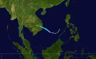 The depression continued organizing, and on the same day at 18:00 UTC, the JTWC upgraded the depression to a tropical storm, giving it the name Dawn.[5] Dawn was a large system, with gales extending 130 nautical miles (240 km; 150 mi) from the center and reaching 150 nautical miles (280 km; 175 mi) in the western quadrants.[4] On November 19 at 06:00 UTC, the JMA upgraded Dawn to a tropical storm,[3] with the JTWC assessing that it had peaked at the same time, with 1-min sustained winds of 45 knots (85 km/h; 50 mph).[6] The same day at 15:00 UTC, Dawn made landfall near Cam Ranh as a tropical storm,[2] with considerable wind shear affecting it, with an exposed low-level circulation.[4] Dawn moved inland and quickly dissipated over northern Cambodia, with the JTWC and the JMA assessing that it had dissipated on November 20.[3][5]