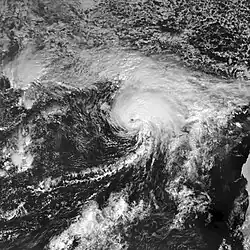 The storm's convection organized around a central core, and the system became a tropical storm on 23 November and received the name Delta.[1] An eye-like feature appeared near the storm's circulatory center several times that day.[2] The larger-scale deep-layered cyclonic circulation within which it was embedded steered it on a slow southward and then south-southwesterly track.[3] Strong wind shear prevented immediate development and the system added an eastward component to its drift.[3] Moving out of the high-shear environment on 24 November, Delta gained organization.[4] Outflow and convective banding increased[4] and an eye feature became well defined.[5] This eye signaled the storm's peak strength of 110 km/h (70 mph), just below hurricane status. However, the official forecast at the time predicted Delta to strengthen further and become a minimal hurricane.[5] Delta's motion stalled as it reached the southern base of a large cyclonic trough over the northern Atlantic within which it was embedded.[5] Maintaining its intensity, Delta remained motionless for half a day[6] until, that evening when it began a slow southward drift at 9.7 km/h (6 mph).[7] Maintaining its intensity, Delta remained motionless for half a day[7] Convection broke down in the storm's western semicircle early on 25 November; the decreased organization caused slight weakening.[5] Maintaining its intensity, Delta remained motionless for half a day[8] The southward motion slowed[9][10] and the weakening trend continued into the evening.[10] Cooling cold tops were counteracted by wind shear which exposed most of the low-level center.[11] The storm moved southwestward on 25 November, then turned toward the southeast and east-northeast the following day. During these maneuvers, Delta grew weaker due to strong wind shear, with its winds decreasing to an estimated 65 km/h (40 mph).[1]