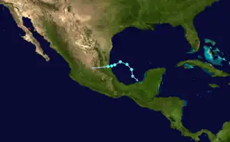 On August 19, 2014, a tropical wave emerged off the west coast of Africa. The system traversed the Atlantic over the next week with no signs of development. Convection finally increased once the wave entered the Caribbean Sea on August 27; however, it was not until August 30 when interaction with a Kelvin wave spurred organization. An area of low pressure consolidated within the system as it crossed the Yucatán Peninsula on August 31.[1] Formation of a banding feature along the southeastern portion of the circulation on September 1 marked the system's transition into a tropical depression by 18:00 UTC while over the Bay of Campeche.[2] Although situated over warm waters of 30 °C (86 °F), strong wind shear created an unfavorable environment and hindered intensification.[2] During this formative stage, the depression tracked northward as its center relocated before turning to the northwest and later west.[1][3] It was uncertain if a closed circulation truly existed due to conflicting data and the depression could have remained a trough until the afternoon of September 2.[1]