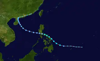 At 18:00 UTC on September 28, the Japan Meteorological Agency (JMA) assessed the formation of a tropical depression near Palau.[2] At 06:00 UTC the next day, the Joint Typhoon Warning Center (JTWC) issued a Tropical Cyclone Formation Alert on the westwardly tracking disturbance, designating it as Tropical Depression 21W.[3] Upon development, the storm showed signs of improving organization.[4] Consolidation continued as the storm approached the Philippines at the eve of October, though intensification was tempered by increasing wind shear and interaction with the archipelago.[5] On September 29, the storm entered the area of responsibility of the Philippine Atmospheric, Geophysical and Astronomical Services Administration (PAGASA), who locally named the system Pablo.[6] The tropical cyclone grazed eastern Samar and tracked towards southern Luzon—with the JMA noting little change in strength—on September 30, guided by a nearby subtropical ridge.[2][7] As the storm moved across the Philippines, its center of circulation became elongated and difficult to locate,[8] though deep convective activity initiated near the center as the storm began to accelerate into the South China Sea on October 1.[9] The JMA upgraded the cyclone to a minimal tropical storm by October 2 with sustained winds of 40 mph (65 km/h) and a minimum pressure of 996 mbar (hPa; 29.47 inHg); Higos would not strengthen further throughout its evolution in the South China Sea.[2] With the upgrade, the system was named Higos.[10] In contrast, the JTWC noted that the system had become disorganized in the same timeframe with a lack of consolidation noted in microwave satellite imagery.[11] Higos remained ill-defined the next day and was consequently downgraded to a tropical depression by the JMA.[2][12] On October 4, the weakening system crossed eastern Hainan and slowed considerably, with land interaction and wind shear creating hostile environmental conditions for Higos.[13] Higos drifted northeastward into mainland China as a tropical depression and eventually dissipated early on October 6.[2]