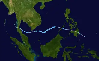 On December 17 at 21:00 UTC, the PAGASA began issuing bulletins for a system 140 nautical miles (260 km) east-southeast of Davao.[2][3] The PAGASA had already recognized the system as a tropical depression and named it Vicky, however at the time, the Japan Meteorological Agency (JMA) only recognized the system as a low-pressure area.[4] The next day, the JMA followed suit and recognized the system as a tropical depression.[5] At 14:00 PHT (6:00 UTC), the system made landfall in Baganga, Davao Oriental.[6] 9 hours later, it emerged off the coast of Misamis Oriental and entered the Bohol Sea, later entering the Sulu Sea on the next day at 5:00 PHT (21:00 UTC).[7] On December 19 at 23:00 PHT (15:00 UTC), Krovanh made its second landfall over central Palawan, emerging into the South China Sea shortly after.[8][9] As the storm traversed the South China Sea, the system had strengthed into a tropical storm according to the JMA as it emerged into a region of relatively favorable atmospheric conditions, thus given the name Krovanh.[10] On December 20 at 14:00 PHT (6:00 UTC), Krovanh left the Philippine Area of Responsibility, although storm signals were still raised for the Kalayaan Islands.[11] The PAGASA then upgraded Krovanh into a tropical storm, and issued a Signal No. 2 warning for the Kalayaan Islands.[12] The next day, December 21, Krovanh was downgraded into a tropical depression by both the JMA and by the PAGASA in their final advisories for the storm.[13][14] The JTWC then issued their final warning on Krovanh the next day shortly after most of its central convection had dissipated due to increasingly hostile wind shear.[15]