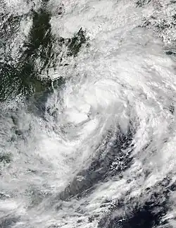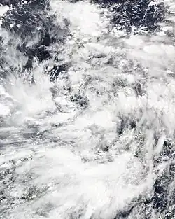 On October 2 at 06:00 UTC, the United States Joint Typhoon Warning Center (JTWC)[nb 1] started to monitor a persistent area of convection in the Philippine Sea, located 495 nautical miles (917 km; 570 mi) to the east of Davao City, Philippines. At that time, satellite visible imagery revealed a disorganized but broad area of circulation with flaring strong thunderstorms. Later analysis by the agency indicated a favorable environment for further development of the system, with warm 30 °C (86 °F) sea surface temperatures, low wind shear and good equatorial outflow.[2][3] Meanwhile, the Philippine Atmospheric, Geophysical and Astronomical Services Administration (PAGASA) upgraded the system to a tropical depression on 2:00 PHT (18:00 UTC) of October 3, assigning it the name Lannie from their naming list as it was already present in their Philippine Area of Responsibility.[4][5] Also that day, the JTWC issued a Tropical Cyclone Formation Alert on the system as it showed enough convection on the west of a discernible low-level circulation center while tracking west-northwestward.[6]