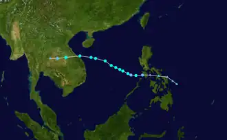 On September 14 at 12:00 UTC, the Japan Meteorological Agency (JMA) began issuing warnings on a tropical depression as it was moving west-northwest.[3] The system continued organizing, and on September 15 at 02:00 UTC, the Joint Typhoon Warning Center (JTWC) issued a Tropical Cyclone Formation Alert on the system as it was located over the Philippines.[4] The system was in a favorable environment, though strengthening was limited due to the disorganized structure.[5] Convection, albeit disorganized, began covering the low-level circulation, and at 15:00 UTC, the JTWC upgraded the system to a tropical depression, giving it the unofficial designation of 13W as it was located approximately 159 nautical miles (294 km; 183 mi) southwest of Manila. Sea surface temperatures in the area ranged from 30–32 °C (86–90 °F).[6] At the same time, the PAGASA began issuing severe weather bulletins on the depression, giving it the local name Leon.[7] 3 hours later at 18:00 UTC, the JMA upgraded the depression to a tropical storm, assigning it the name Noul.[8] At 21:00 on September 16, the storm left the PAR and PAGASA issued its final warning on the system.[9] At 03:00 UTC September 18, Noul made landfall between Quảng Trị and Thừa Thiên-Huế provinces. At 9:00 UTC, the JTWC issued its final warning on the system.[10] After being downgraded to a low pressure area (LPA), Noul followed a westward path and emerged in the Indian Ocean.