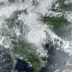 Weakening, as Ruth entered the Gulf of Tonkin early on 15 September, landfall had taken its toll on the system, causing it to weaken a minimal tropical storm.[2][1] Despite that, the Gulf of Tonkin, which at the time, was as hot as 29 °C (84 °F), was a conducive environment for the weak cyclone to cross into, resulting in Ruth significantly intensifying.[1] As a result, according to the JTWC, Ruth underwent rapid intensification, peaking as a minimal typhoon with 1-minute sustained winds of 75 mph (120 km/h).[1] The JMA, however, stated that Ruth had actually peaked with 10-minute sustained winds of 65 mph (100 km/h) at that time.[2] Just a few hours later, early on 16 September, Ruth made landfall south of Thanh Hóa, Vietnam at peak intensity.[1] Rapidly weakening once inland, a few hours later, the JTWC stopped tracking Ruth, claiming it had dissipated.[1] However, the JMA kept tracking a weakening Ruth until September 17.[2] The remnants of Ruth later dissipated in Bilauktaung Range early the next day.[1]