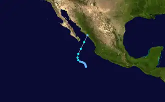 Sonia made landfall near El Dorado, Sinaloa as a rapidly weakening tropical storm on November 4, causing heavy rainfall over portions of Mexico.[1] Several inches of precipitation was recorded in Cabo San Lucas along with winds of around 30 mph (50 km/h), as the storm passed close to the resort city.[11] Heavy precipitation also occurred in the states of Nayarit, Jalisco, Durango, Chihuahua, and Aguascalientes.[12] In Nayarit, one person was killed after being struck by lightning according to the Secretariat of National Defense (SEDENA).[1] Overall damage was minor, with estimates in Sinaloa is estimated to be MXN$8.8 million (US$690,000). [13][14]