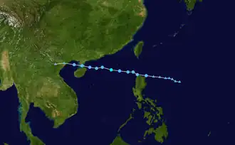 On July 10, PAGASA issued their final advisory on Tropical Depression Gorio as it moved out of their area of responsibility.[7] Hampered by an unfavorable upper-level environment, the depression barely intensified into a tropical storm early on July 11.[8] Upon becoming a tropical storm, the JMA named the system Soudelor reporting peak winds of 65 km/h, (40 mph).[6][9] Later that day the JTWC reported that Soudelor had weakened into a depression;[10] however they re-upgraded it to a tropical storm as it moved closer to Hainan Province.[11] Shortly before landfall in Leizhou Peninsula, China, the JTWC downgraded the storm to a tropical depression.[12] After moving back over water in the Gulf of Tonkin, the JTWC issued their final advisory on the depression.[13] The JMA, however, continued to monitor Soudelor until it made landfall near Fangchenggang, China several hours later.[14]