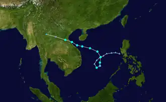 Tropical Depression 16W formed 205 nautical miles (380 km) east-southeast of Dong Tac Airport, Vietnam on the morning of 16 September. It reached tropical storm strength overnight local time and was named Vicente, a Chamorro male name. Shortly after forming, Vicente interacted with a tropical disturbance west of Luzon and made a cyclonic loop. Vicente then absorbed the disturbance before passing just south of Hainan Island. Eventually, Vicente made landfall on the Vietnam coast northwest of Huế on 18 September and gradually dissipated.[1]