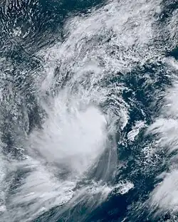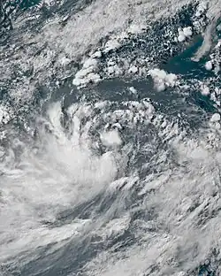 By June 11, the depression intensified into a tropical storm and was named Wutip by the JMA.[10] This was the fifth-latest first appearance of a named storm in a season in the Western North Pacific basin—after Nichole in 1998 (July 9), Nepartak in 2016 (July 3), Wilma in 1973 (July 1), and Sarah in 1983 (June 25).[11] However, the JTWC did not follow suit, as satellite imagery showed a small, fully exposed low-level circulation centre, with convection beginning to develop once more near the centre.[12] Later, it was under a favourable environment influenced by sea surface temperature,[13] and despite its limited structure, low-level cloud bands were visible surrounding the circulation.[14] The JTWC followed suit at 21:00 UTC that day after deep convection developed over the low-level circulation centre,[15] and by June 12, satellite imagery revealed well-defined convective banding tightly wrapping around an obscured low-level centre.[16]