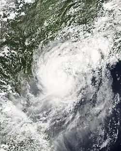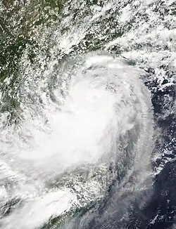 A microwave image revealed the presence of an eye feature, with convective bands wrapping around the storm's southern semicircle, as it remained nearly stationary to the west of Hainan, China, in the Gulf of Tonkin.[21] As Wutip approached the subtropical ridge axis,[22] it curved northeastwards and began to accelerate.[22][23] It briefly passed over the far western part of Hainan Island and made its first landfall near Dongfang city around 23:00 CST (15:00 UTC) on June 13,[22] before reemerging over the Gulf of Tonkin shortly afterwards.[24] On June 14, the JTWC reported that Wutip had rapidly intensified into a minimal typhoon, with one-minute sustained winds of 120 km/h (75 mph), as satellite imagery revealed a 27.8-kilometre-wide (17.3 mi; 15 nmi) small eye surrounded by shallow to moderate convective activity, although deep convection had largely collapsed.[25] On the same day, Wutip made its second landfall near Leizhou city in Guangdong province at around 12:30 CST (04:30 UTC).[26] After landfall, the storm weakened into a minimal tropical storm as satellite imagery showed that the eye feature had filled in, prompting the JTWC to discontinue warnings at 09:00 UTC that day.[27] Once inland, the JMA downgraded Wutip to a tropical depression on the same day and continued tracking the system until it dissipated at 12:00 UTC on June 15.[28][29]