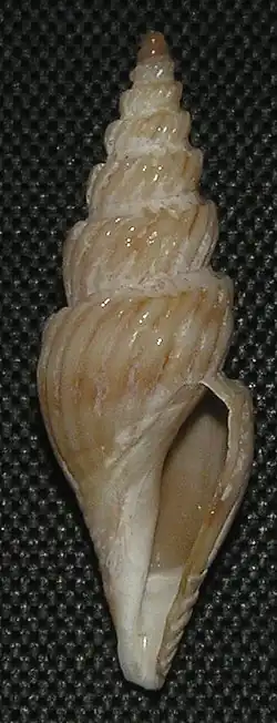 The size of the shell attains 23.5 mm, its width 7 mm. (Original description) The fusiform shell is acuminated at both ends. Its color is light brown without markings. The spire is acutely turreted. It contains 8 whorls. The apical ones are smooth rounded oblique. The rest are deeply and smoothly concave at the top, then slightly convex, furnished with numerous oblique rounded smooth close-set ribs, the ribs terminating in a well-defined angle at the top. The body whorl is about equal in length to the spire, slightly convex above and tapering below. It is spirally lirate towards the base and scarcely rostrate. The aperture is oblong, its interior smooth and, brown. The columella is rather straight . The outer lip is thin, arched, with a moderate posterior sinus situated close to the suture.[2]